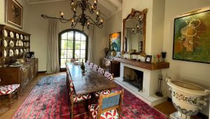 The right wing comprises the spacious kitchen and a guest toilet, the dining room has a fireplace and access also to the pool and garden.