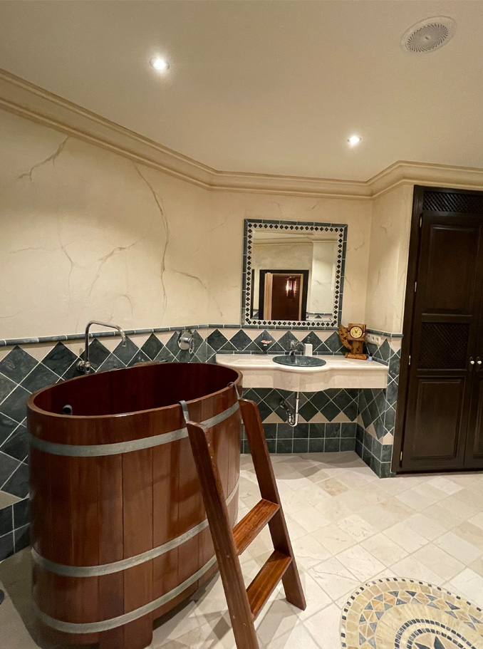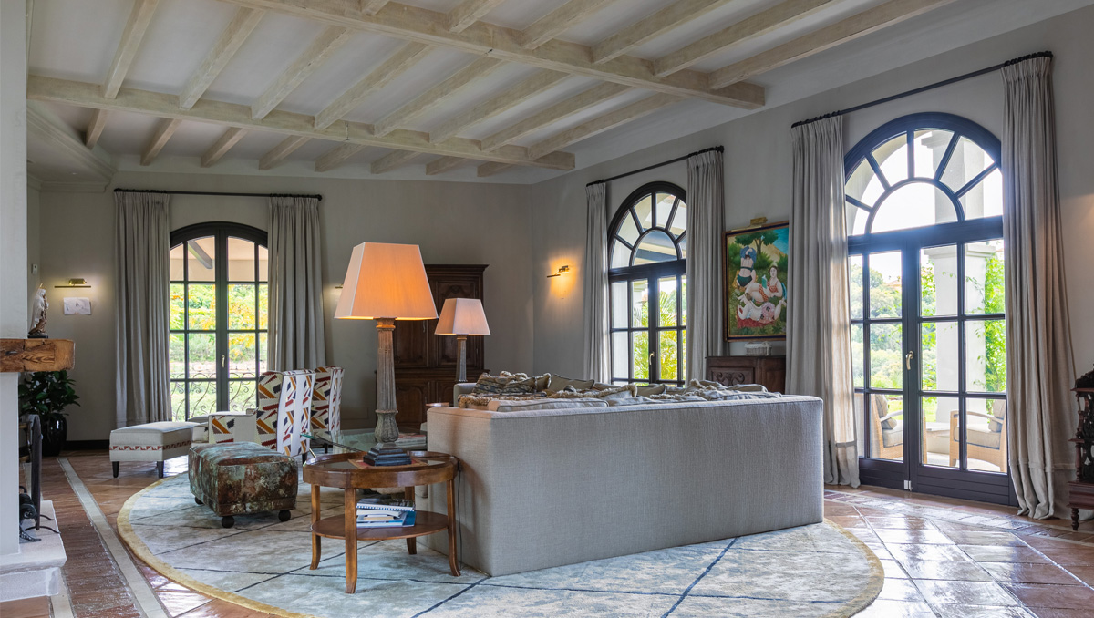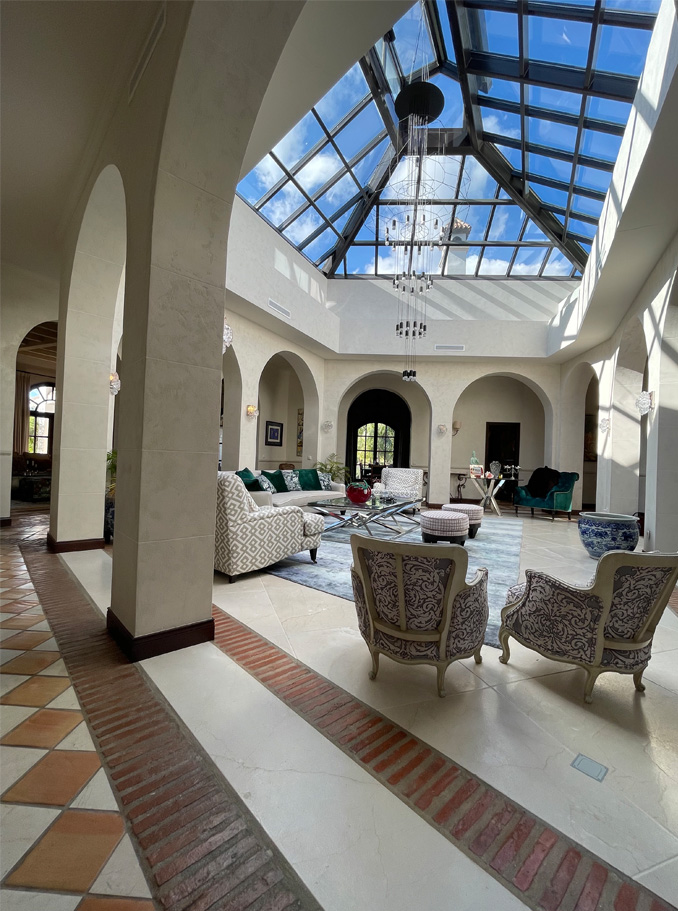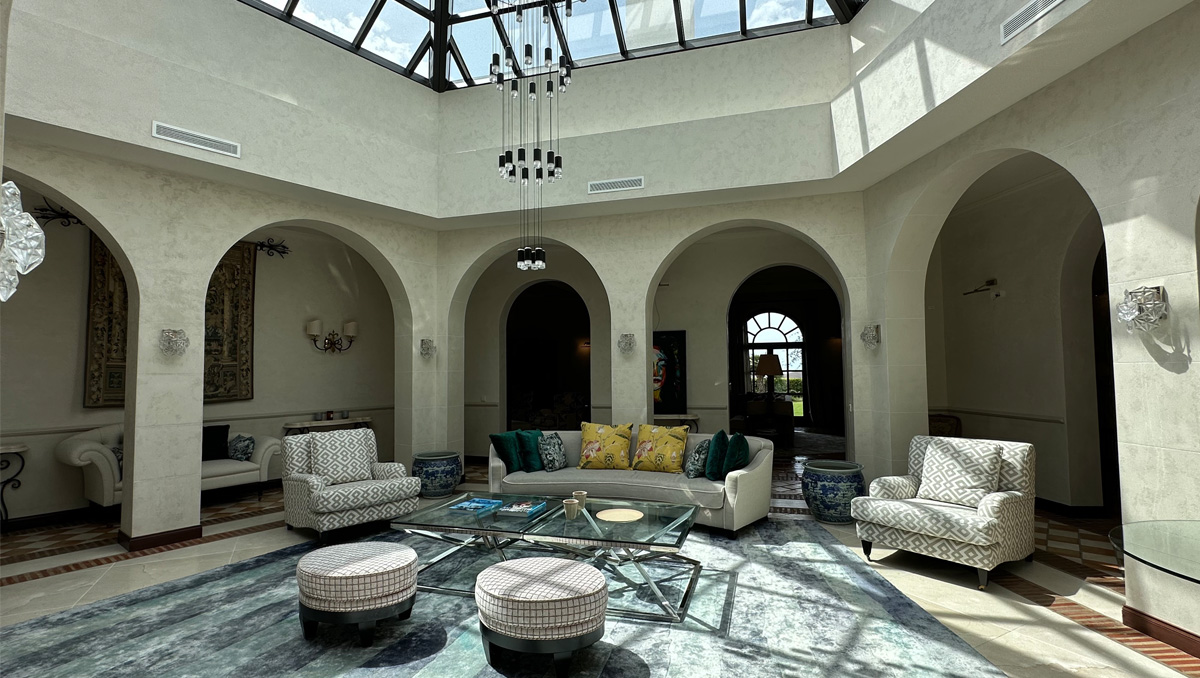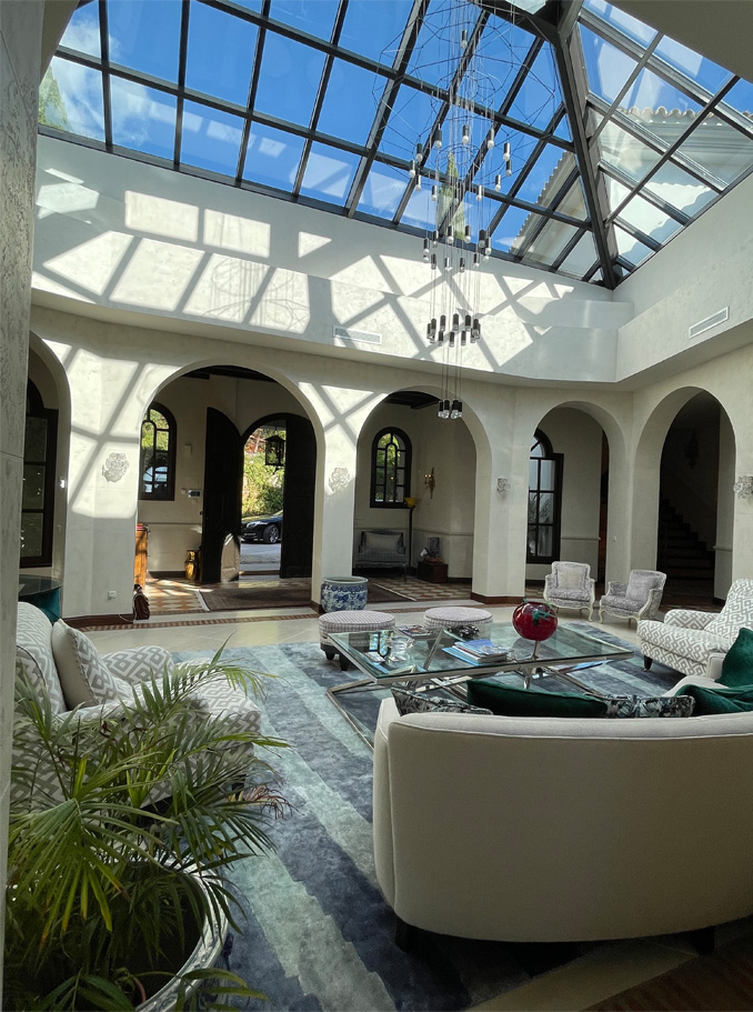 Above all, the main floor of this luxury villas in Marbella comprises 2 wings with an impressive entrance hall with an interior patio with skylight and a light and airy living room with a fireplace giving access to the garden and swimming pool.