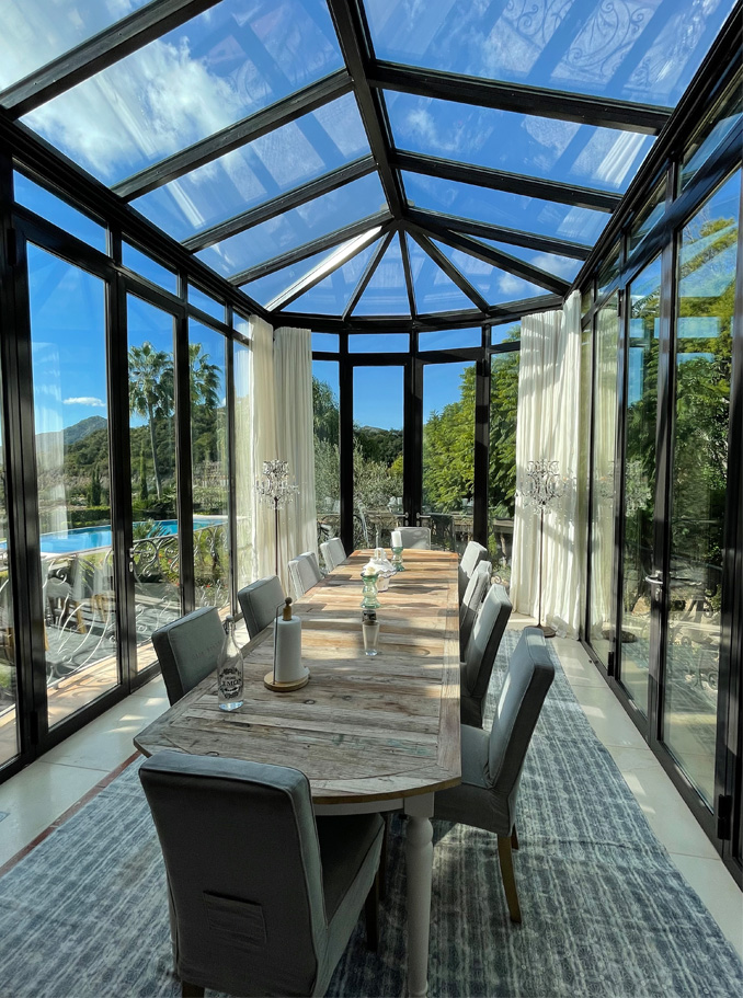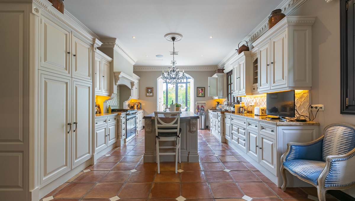 The right wing comprises the spacious kitchen and a guest toilet, the dining room has a fireplace and access also to the pool and garden.