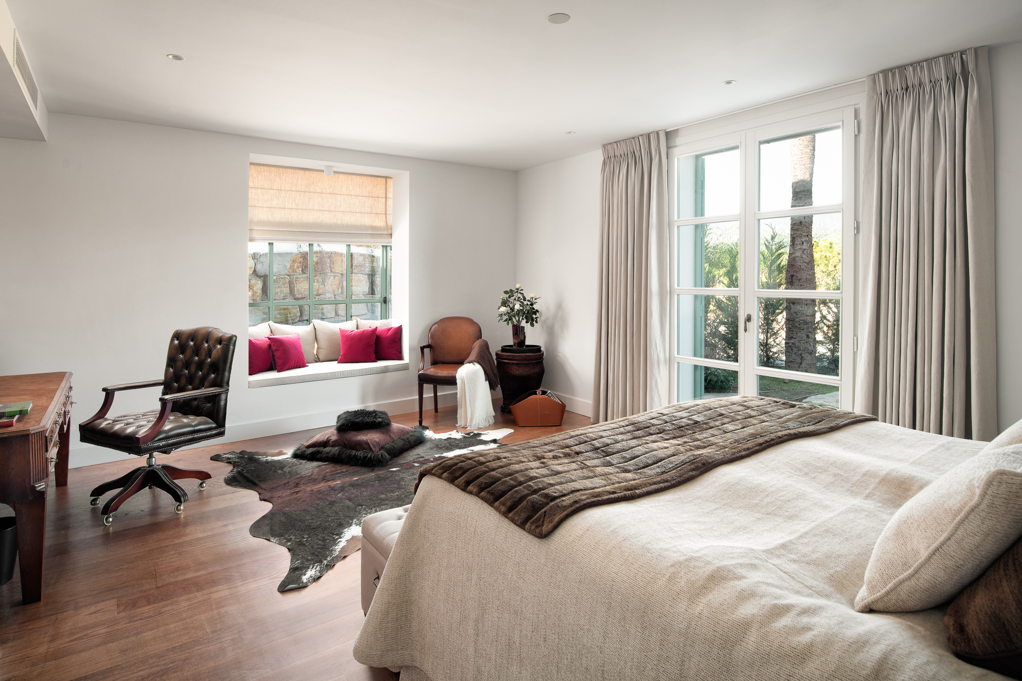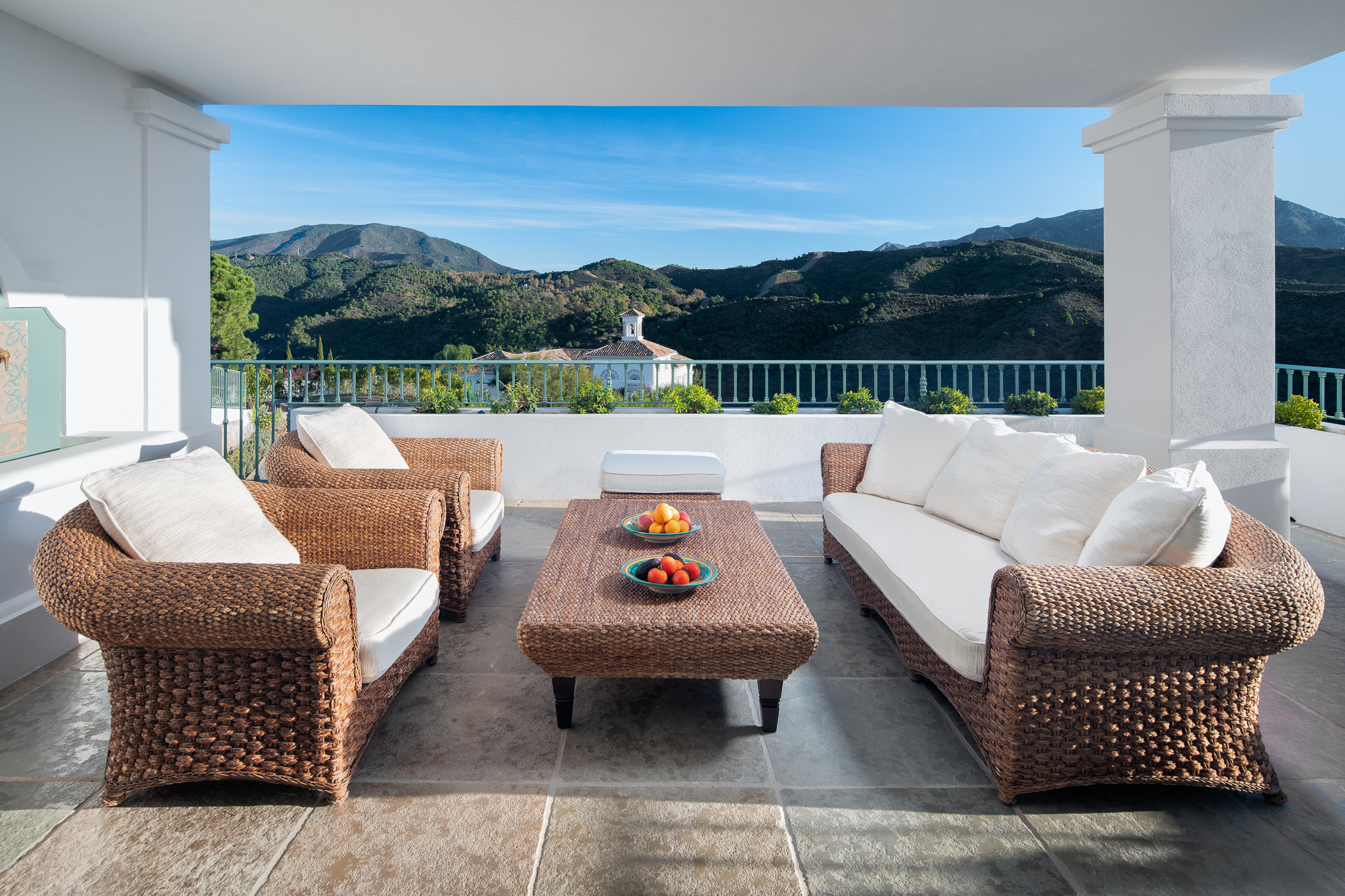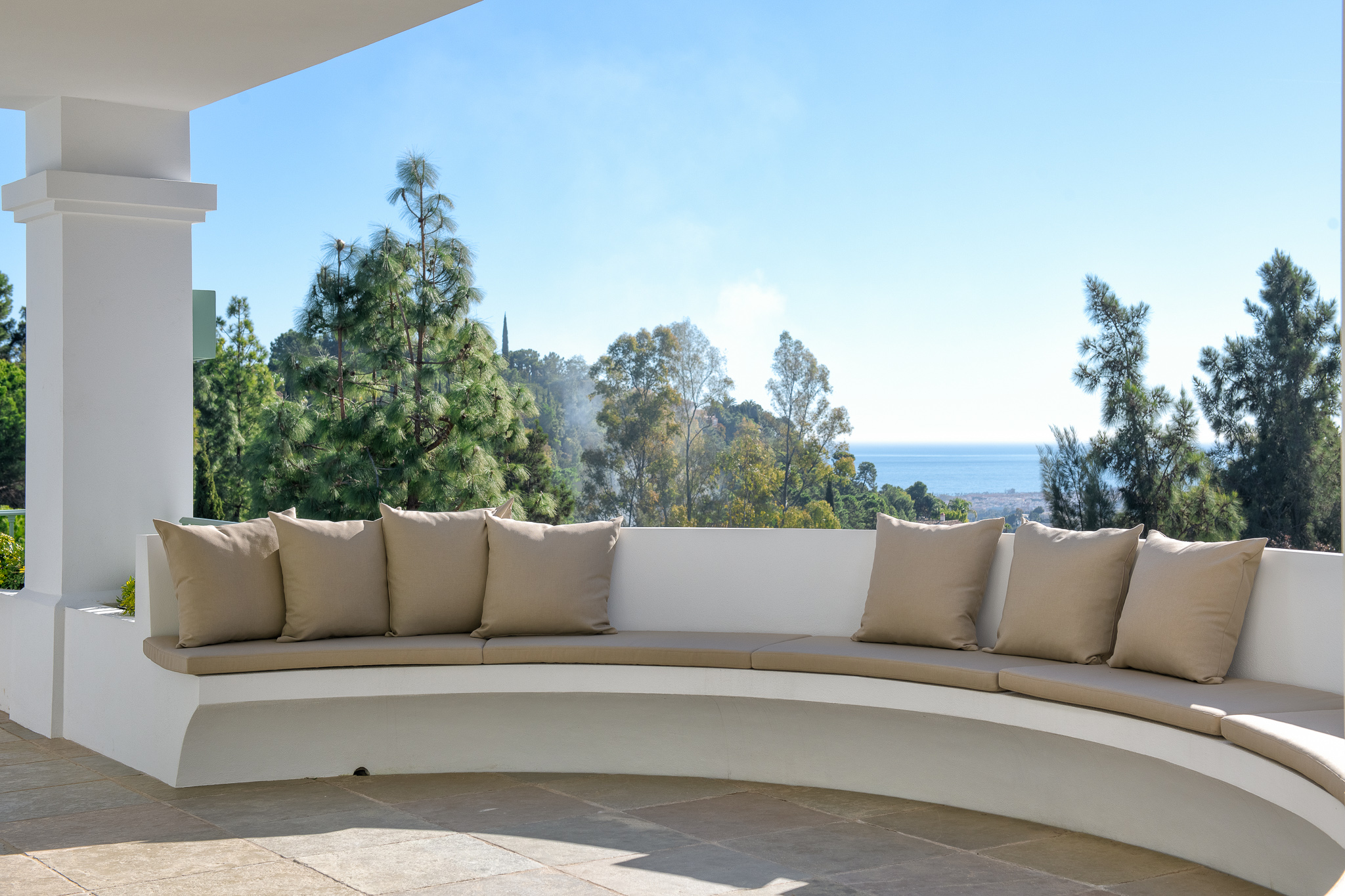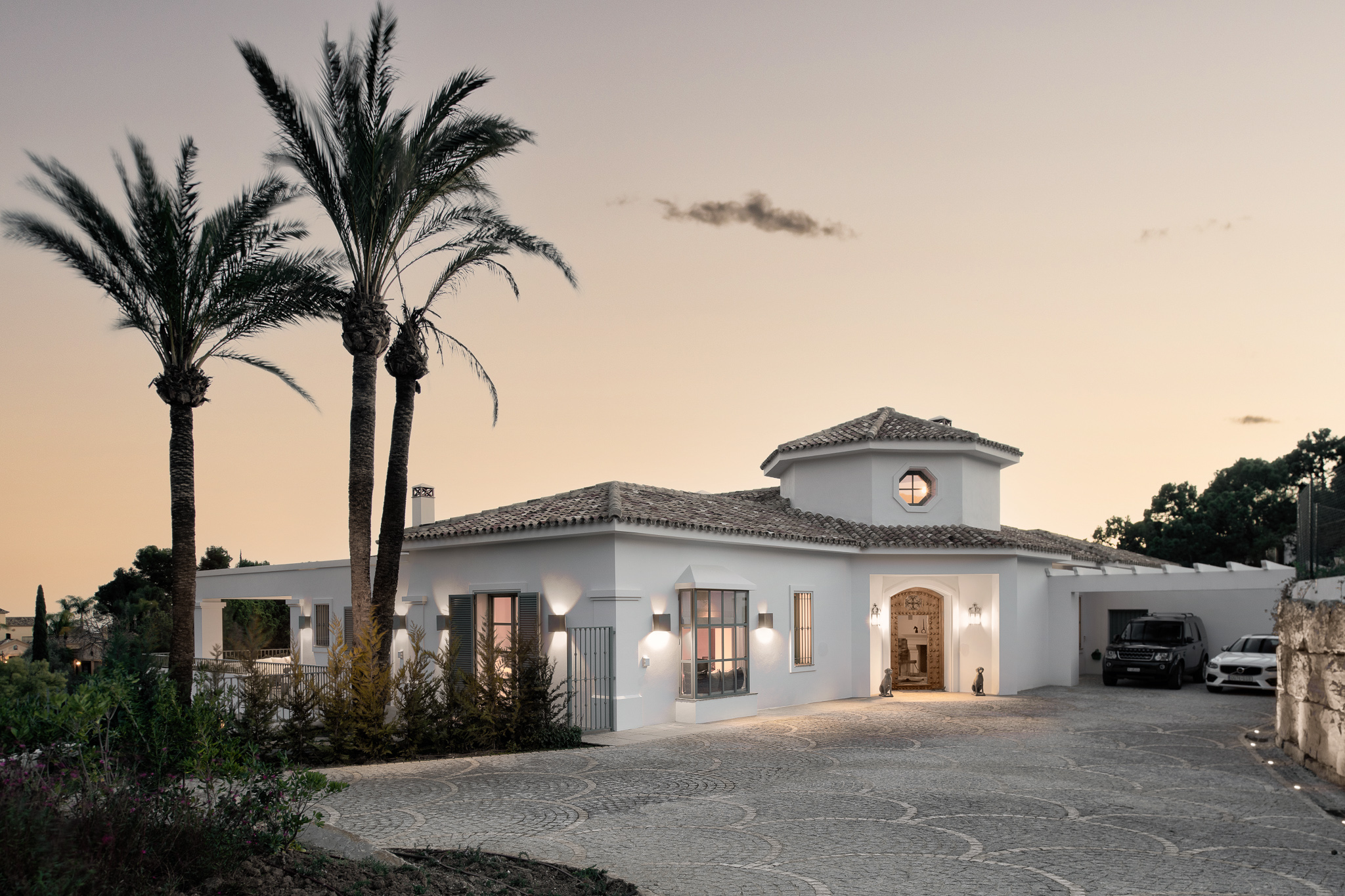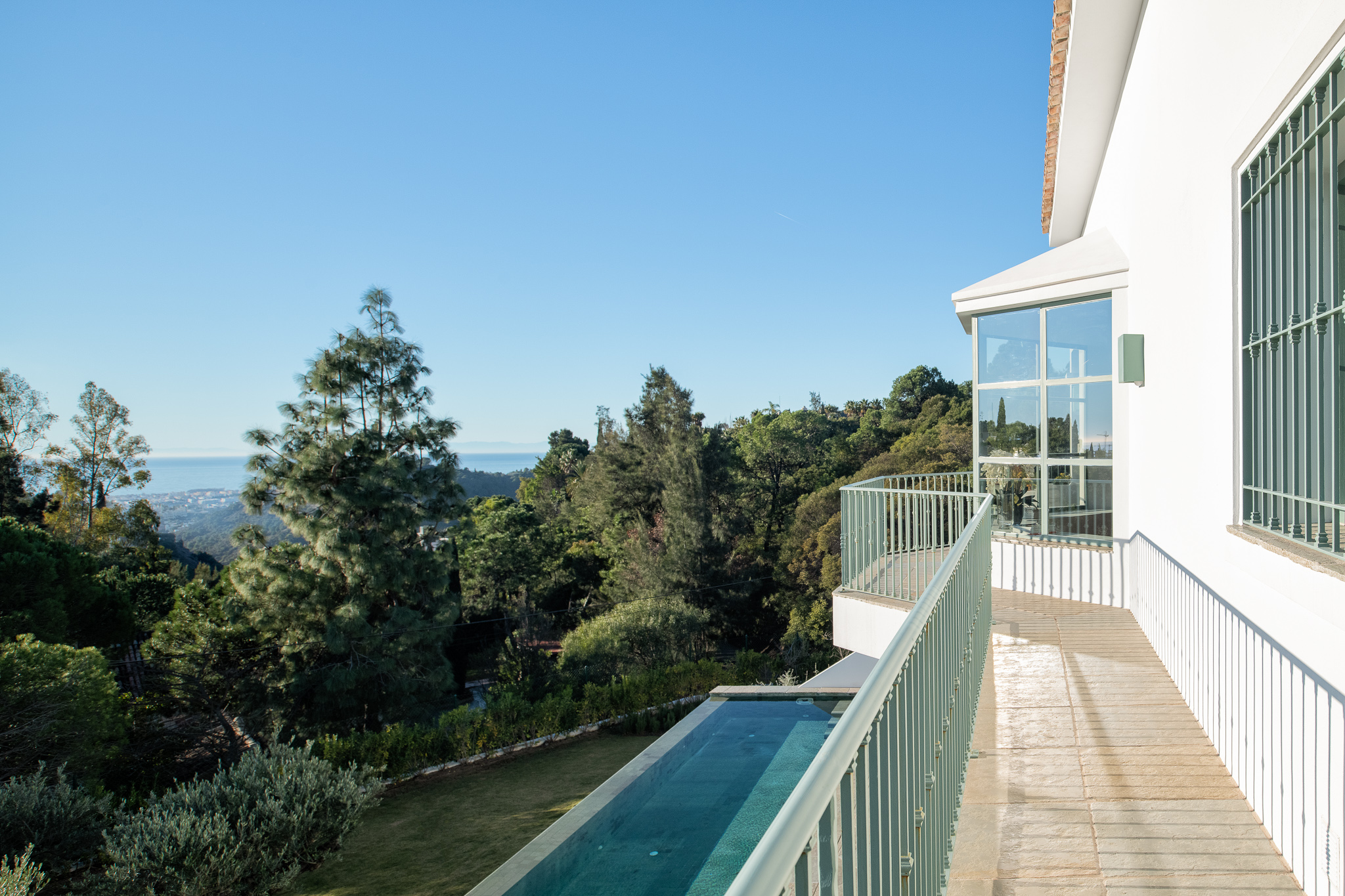 Situated in the gated residential urbanisation of El MadroƱal, a pine and cork forested area with stunning views over the Mediterranean coast and designed by renowned architect CƩsar Leyva, known for his elegant Andalusian cortijo like properties. El MadroƱal enjoys 24 hour security and access via 6 gates along the Ronda road, and is located at just a couple of minutes drive to shops and all types of services. Finished at the end of 2021, this brand new property sits beautifully on a landscaped plot of just over 3000m2 and enjoys stunning views over the mountains to the east and lovely views down the valley to the sea to the south. The property features B&O surround sound and Domotic as well as Geothermal heating and cooling system. The main living area spreads over one floor, with further guest and staff area on the lower ground floor. The entrance drive leads into a carport for two cars and the main entrance to the property on ground level as well as to the staff apartment on the lower ground level. There is project to enclose the carport with entrance directly into the property via a cloakroom, ideal for rainy days and additionally via the main door. Beautiful antique wooden doors open up to a spacious entrance hall with an imposing fireplace, cloakroom and guest w.c. To the right is the main bedroom suite with access to main terrace and to the back garden, ideal for enjoying the shade in the hotter months of the year. To the left of the entrance is a spacious guest bedrooms suite or second main bedroom with access to lovely small garden area, ideal for creating an outside breakfast/coffee area to sit and enjoy countryside views. The open plan living room features double height vaulted ceilings with wooden beams, a grand fireplace and dining area which overlooks the pool, garden and valley down to the sea through a beautiful bay window. The living leads out onto the main terrace with a lovely tailor made seating area from which to enjoy the peace and quiet of El MadroƱal, as well as views of the green areas and the sea in the distance. There is pre-installation for an exterior fireplace which would provide a great additional feature to enjoy the colder months outside. Off the living room is an open plan kitchen of Swedish design, with a large sliding door which allow you to separate both rooms if needed. The kitchen has access to a lovely covered terrace with a fountain with drinking water, from which to enjoy the stunning countryside views. Adjacent to the kitchen is a spacious pantry, laundry room with double barn doors leading out and a glass bodega which is beautifully lit up at night. The wide staircase leads down to the guest and staff area at garden level. The self contained staff apartment has its own independent access, and two additional guest bedroom suites enjoy direct access onto the pool area. A treatment/massage room and gymnasium with coffee/tea area and pre installation for a sauna with direct access to the 15mts long salt water jet pool make this a home to enjoy and relax. Additional features include tailor made cushions and fabrics and hand made exterior light fittings.