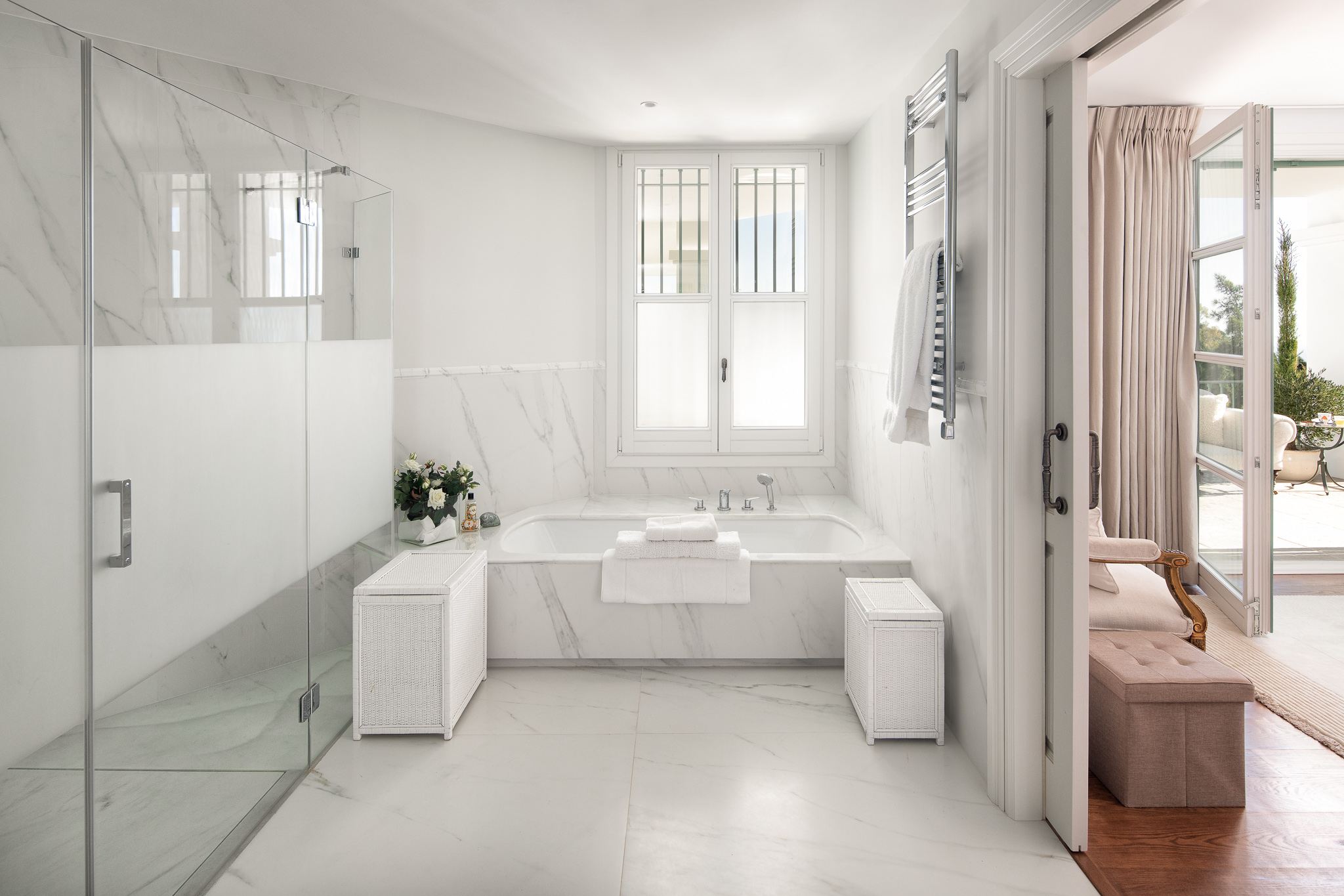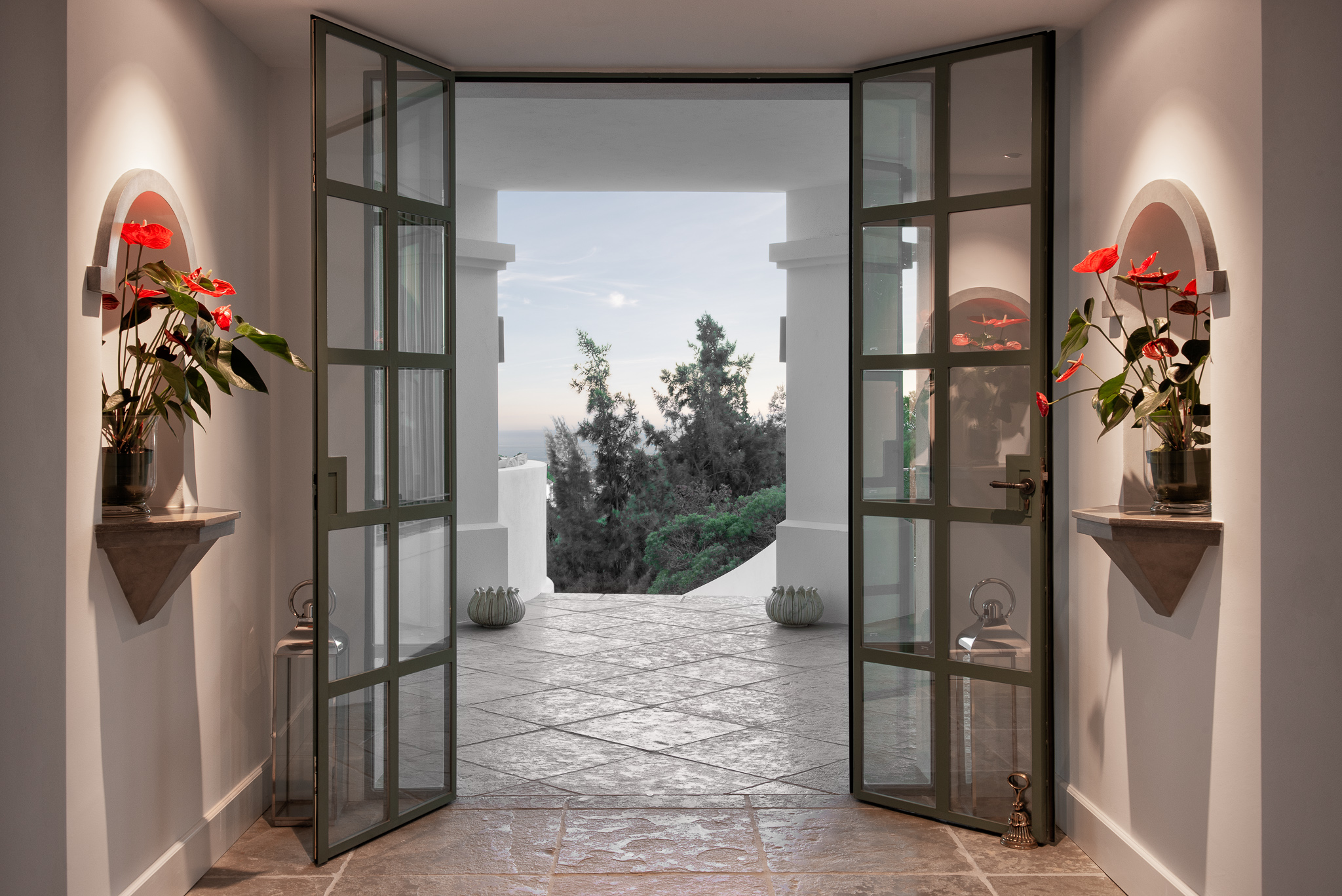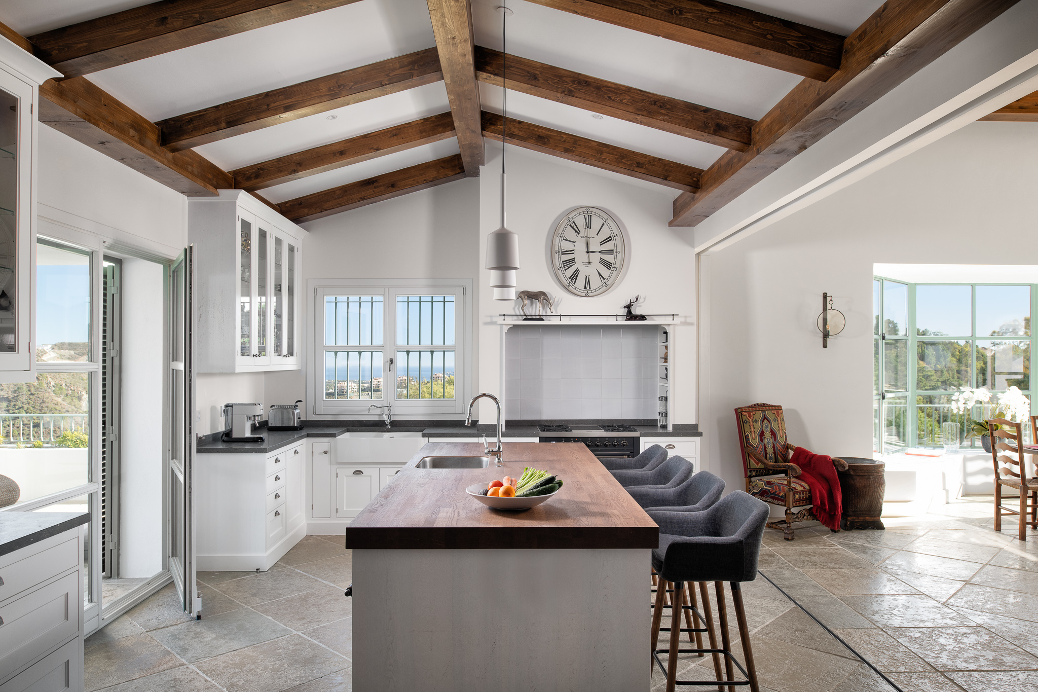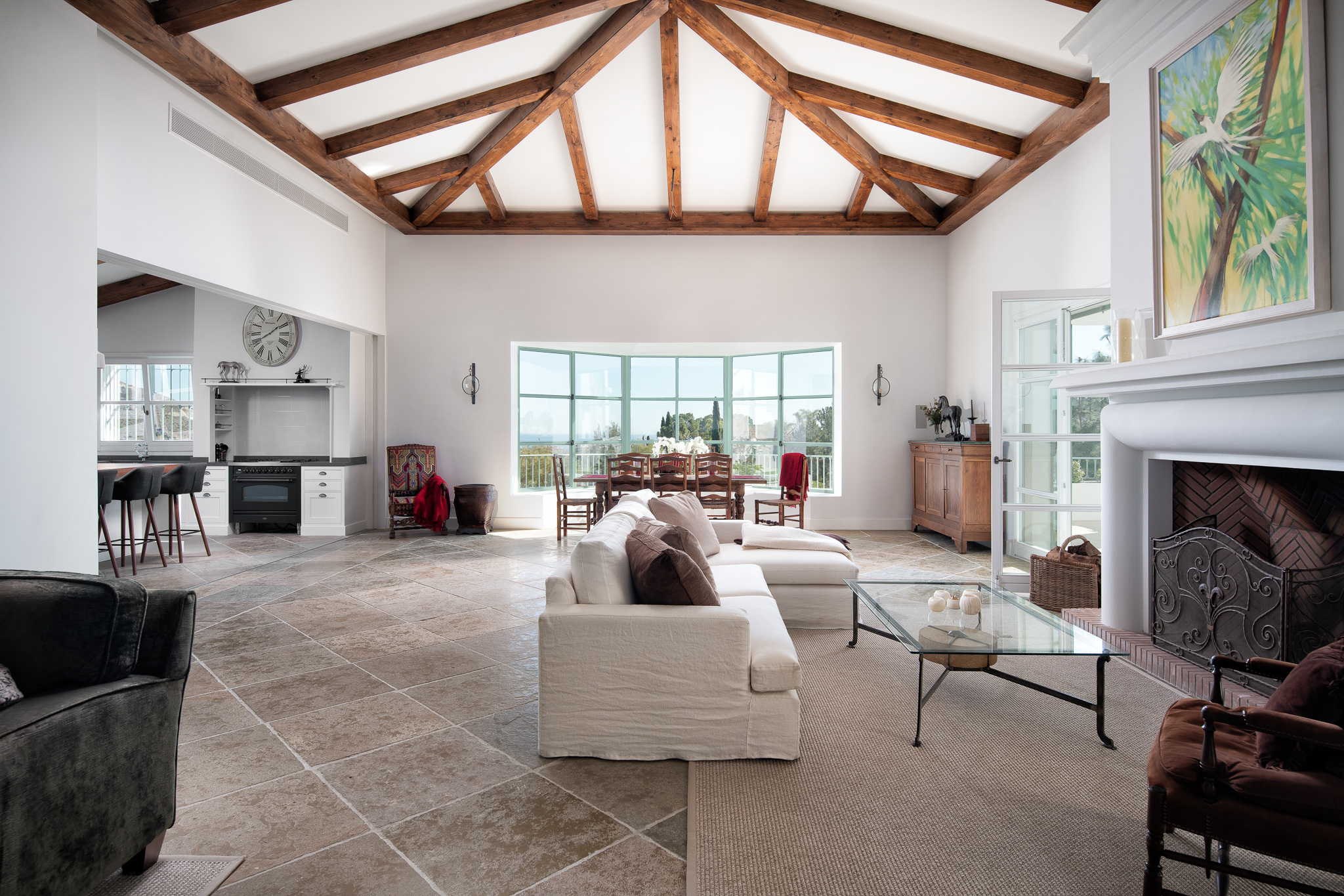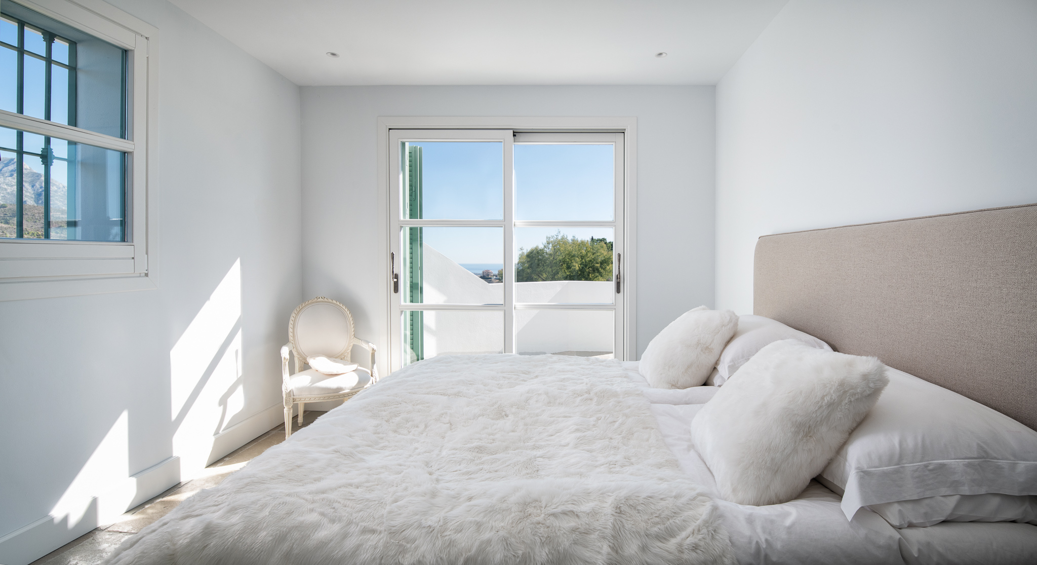 Situated in the gated residential urbanisation of El MadroƱal, a pine and cork forested area with stunning views over the Mediterranean coast and designed by renowned architect CƩsar Leyva, known for his elegant Andalusian cortijo like properties. El MadroƱal enjoys 24 hour security and access via 6 gates along the Ronda road, and is located at just a couple of minutes drive to shops and all types of services. Finished at the end of 2021, this brand new property sits beautifully on a landscaped plot of just over 3000m2 and enjoys stunning views over the mountains to the east and lovely views down the valley to the sea to the south. The property features B&O surround sound and Domotic as well as Geothermal heating and cooling system. The main living area spreads over one floor, with further guest and staff area on the lower ground floor. The entrance drive leads into a carport for two cars and the main entrance to the property on ground level as well as to the staff apartment on the lower ground level. There is project to enclose the carport with entrance directly into the property via a cloakroom, ideal for rainy days and additionally via the main door. Beautiful antique wooden doors open up to a spacious entrance hall with an imposing fireplace, cloakroom and guest w.c. To the right is the main bedroom suite with access to main terrace and to the back garden, ideal for enjoying the shade in the hotter months of the year. To the left of the entrance is a spacious guest bedrooms suite or second main bedroom with access to lovely small garden area, ideal for creating an outside breakfast/coffee area to sit and enjoy countryside views. The open plan living room features double height vaulted ceilings with wooden beams, a grand fireplace and dining area which overlooks the pool, garden and valley down to the sea through a beautiful bay window. The living leads out onto the main terrace with a lovely tailor made seating area from which to enjoy the peace and quiet of El MadroƱal, as well as views of the green areas and the sea in the distance. There is pre-installation for an exterior fireplace which would provide a great additional feature to enjoy the colder months outside. Off the living room is an open plan kitchen of Swedish design, with a large sliding door which allow you to separate both rooms if needed. The kitchen has access to a lovely covered terrace with a fountain with drinking water, from which to enjoy the stunning countryside views. Adjacent to the kitchen is a spacious pantry, laundry room with double barn doors leading out and a glass bodega which is beautifully lit up at night. The wide staircase leads down to the guest and staff area at garden level. The self contained staff apartment has its own independent access, and two additional guest bedroom suites enjoy direct access onto the pool area. A treatment/massage room and gymnasium with coffee/tea area and pre installation for a sauna with direct access to the 15mts long salt water jet pool make this a home to enjoy and relax. Additional features include tailor made cushions and fabrics and hand made exterior light fittings.